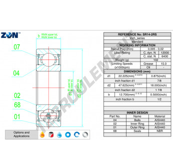 Le Roulement à Billes, connu sous la référence SR14-2RS-ZEN, de la marque ZEN, possède un diamètre intérieur de 22.2mm, un diamètre extérieur de 47.6mm et une épaisseur de 12.7mm.