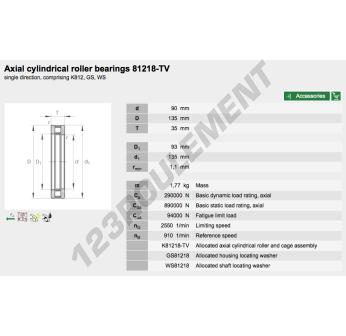 La Butée à Rouleaux, connue sous la référence 81218-TV-INA, de la marque INA, possède un diamètre intérieur de 90 mm, un diamètre extérieur de 135 mm et une épaisseur de 35 mm.