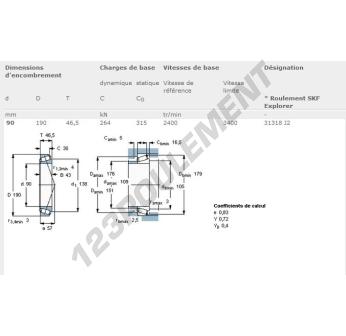 Le Roulement Conique, connu sous la référence 31318J2-SKF, de la marque SKF, possède un diamètre intérieur de 90mm, un diamètre extérieur de 190mm et une épaisseur de 46.5mm.