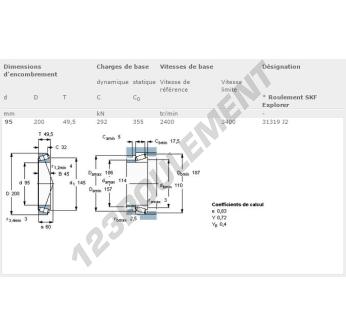 Le Roulement Conique, connu sous la référence 31319-J2-SKF, de la marque SKF, possède un diamètre intérieur de 95mm, un diamètre extérieur de 200mm et une épaisseur de 49.5mm.