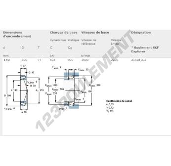 Le Roulement Conique, connu sous la référence 31328XJ2-SKF, de la marque SKF, possède un diamètre intérieur de 140mm, un diamètre extérieur de 300mm et une épaisseur de 77mm.