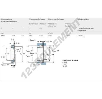 Le Roulement Conique, connu sous la référence 32030-X-SKF, de la marque SKF, possède un diamètre intérieur de 150mm, un diamètre extérieur de 225mm et une épaisseur de 48mm.
