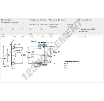 Le Roulement Conique, connu sous la référence 32032X-SKF, de la marque SKF, possède un diamètre intérieur de 160mm, un diamètre extérieur de 240mm et une épaisseur de 51mm.