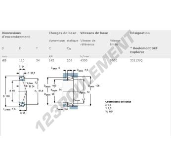Le Roulement Conique, connu sous la référence 33113-SKF, de la marque SKF, possède un diamètre intérieur de 65mm, un diamètre extérieur de 110mm et une épaisseur de 34mm.