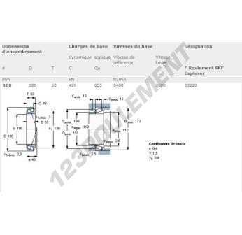 Le Roulement Conique, connu sous la référence 33220-SKF, de la marque SKF, possède un diamètre intérieur de 100mm, un diamètre extérieur de 180mm et une épaisseur de 63mm.