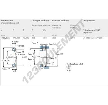 Le Roulement Conique, connu sous la référence LM241147-LM241110-VQ051-SKF, de la marque SKF, possède un diamètre intérieur de 200.025mm, un diamètre extérieur de 276.225mm et une épaisseur de 46.038mm.