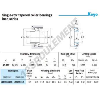 Le Roulement Conique, connu sous la référence LM503349R-LM503310-JTEKT, de la marque JTEKT, possède un diamètre intérieur de 45.987mm, un diamètre extérieur de 74.976mm et une épaisseur de 18mm.