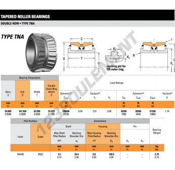 Le Roulement Conique, connu sous la référence NA455-452D-TIMKEN, de la marque TIMKEN, possède un diamètre intérieur de 50.8mm, un diamètre extérieur de 107.95mm et une épaisseur de 65.09mm.