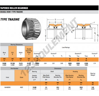 Le Roulement Conique, connu sous la référence NA456SW-452D-TIMKEN, de la marque TIMKEN, possède un diamètre intérieur de 50.8mm, un diamètre extérieur de 107.95mm et une épaisseur de 74.615mm.