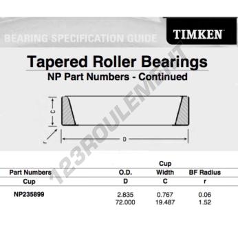La Cuvette, connue sous la référence NP235899-TIMKEN, de la marque TIMKEN, possède un diamètre extérieur de 72mm.