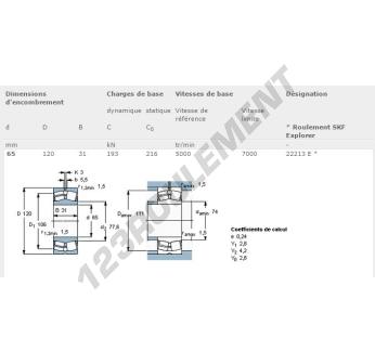 Le Roulement à Rotule Sur Rouleaux, connu sous la référence 22213-E-SKF, de la marque SKF, possède un diamètre intérieur de 65 mm, un diamètre extérieur de 120 mm et une épaisseur de 31 mm.