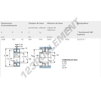 Le Roulement à Rotule Sur Rouleaux, connu sous la référence 22222-E-SKF, de la marque SKF, possède un diamètre intérieur de 110 mm, un diamètre extérieur de 200 mm et une épaisseur de 53 mm.