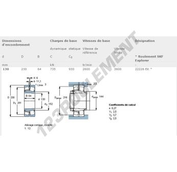 Le Roulement à Rotule Sur Rouleaux, connu sous la référence 22226-EK-SKF, de la marque SKF, possède un diamètre intérieur de 130 mm, un diamètre extérieur de 230 mm et une épaisseur de 64 mm.