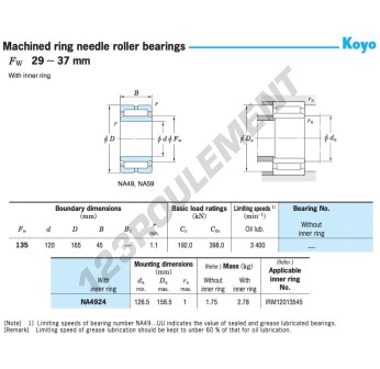 Le Roulement à Rouleaux, connu sous la référence NA4924-JTEKT, de la marque JTEKT, possède un diamètre intérieur de 120 mm, un diamètre extérieur de 165 mm et une épaisseur de 45 mm.