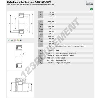Le Roulement à Rouleaux, connu sous la référence NJ2215-E-XL-TVP2-FAG, de la marque FAG, possède un diamètre intérieur de 75 mm, un diamètre extérieur de 130 mm et une épaisseur de 31 mm.