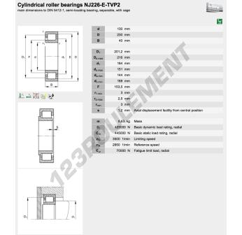 Le Roulement à Rouleaux, connu sous la référence NJ226-E-TVP2-FAG, de la marque FAG, possède un diamètre intérieur de 130 mm, un diamètre extérieur de 230 mm et une épaisseur de 40 mm.