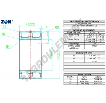 Le Roulement à Rouleaux, connu sous la référence NNCF5034-V-C3-ZEN, de la marque ZEN, possède un diamètre intérieur de 170 mm, un diamètre extérieur de 260 mm et une épaisseur de 122 mm.
