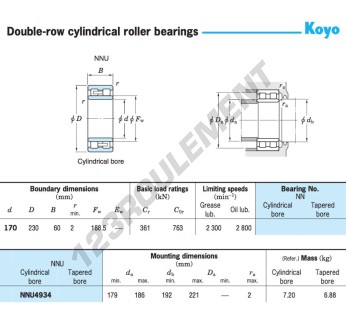 Le Roulement à Rouleaux, connu sous la référence NNU4934-JTEKT, de la marque JTEKT, possède un diamètre intérieur de 170 mm, un diamètre extérieur de 230 mm et une épaisseur de 60 mm.