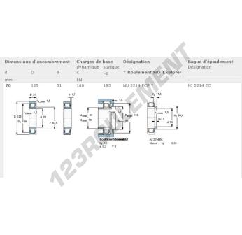 Le Roulement à Rouleaux, connu sous la référence NU2214-ECP-SKF, de la marque SKF, possède un diamètre intérieur de 70 mm, un diamètre extérieur de 125 mm et une épaisseur de 31 mm.