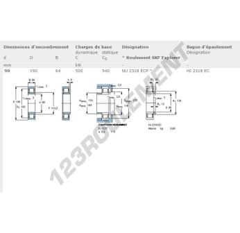 Le Roulement à Rouleaux, connu sous la référence NU2318-ECP-SKF, de la marque SKF, possède un diamètre intérieur de 90 mm, un diamètre extérieur de 190 mm et une épaisseur de 64 mm.
