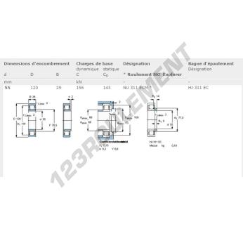 Le Roulement à Rouleaux, connu sous la référence NU311-ECM-SKF, de la marque SKF, possède un diamètre intérieur de 55 mm, un diamètre extérieur de 120 mm et une épaisseur de 29 mm.