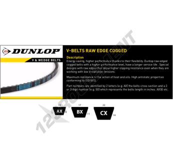 La courroie AX41-DUNLOP de la famille des Courroie Trapézoïdale Crantée, de marque DUNLOP, et de profil AX. Elle a une section de 13mm x 8mm avec une longueur intérieure de 1041 mm, une longueur extérieure de 1091 mm, une longueur primitive de 1071mm et une largeur de 13mm.